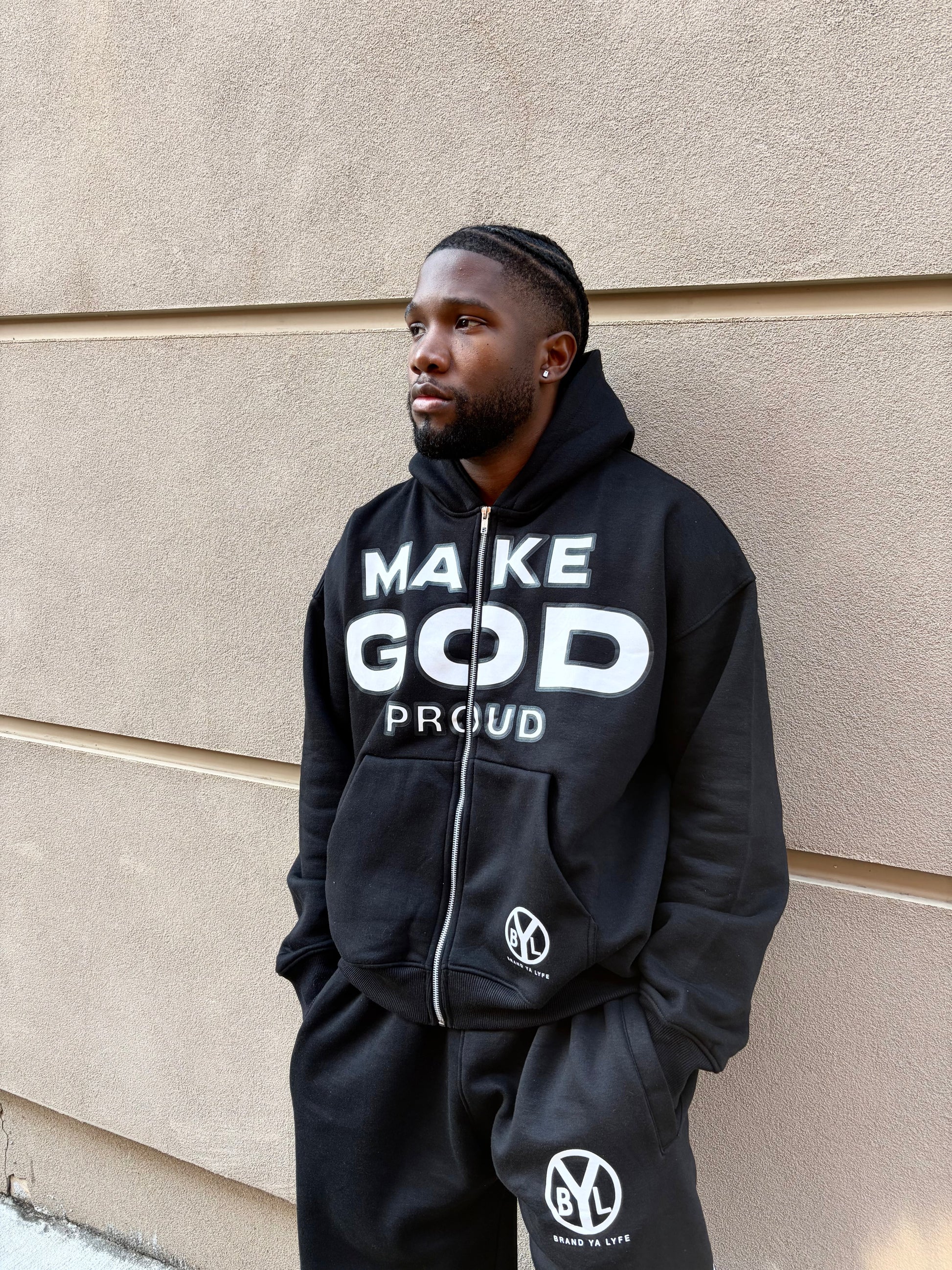 - Fully custom Zip Up hoodie with our new "Make God Proud" Design